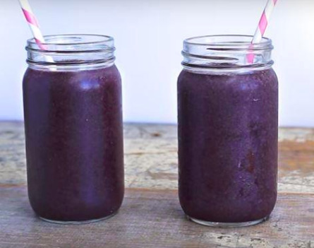 - Kombiner bananer, blåbær, koriander, byggræsjuicepulver, spirulina og søl med saften af en appelsin i en blender og blend, indtil du får en cremet smoothie.
