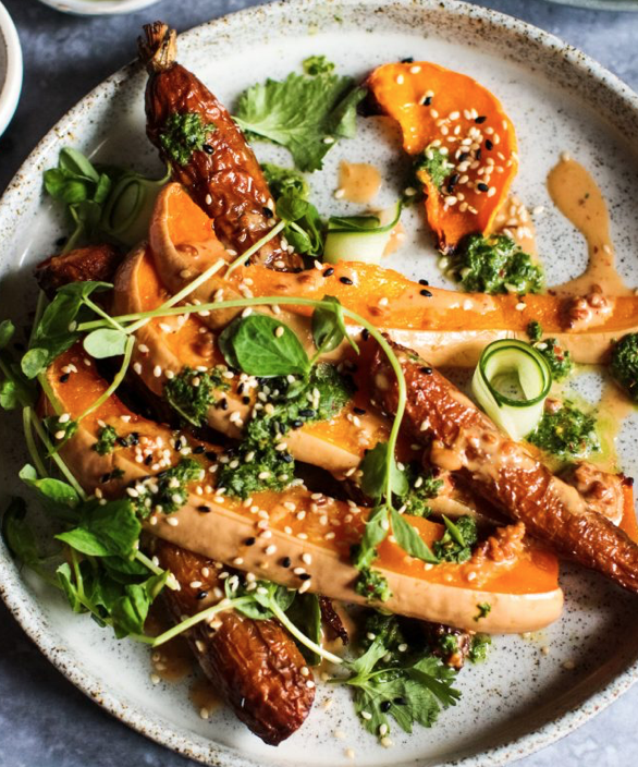 Stegte squash & gulerødder med peanut butter dressing & urter