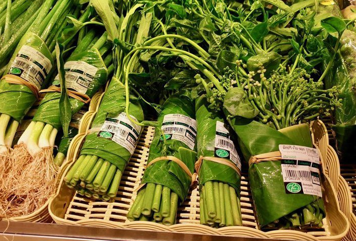Det thailandske supermarked Rimping i Changmai Thailand er startet med at indpakke udvalgte fødevarer i bananblade. Indpakningen bliver bundet sammen med et tyndt stykke bambus, så alt emballage er bionedbrydeligt.